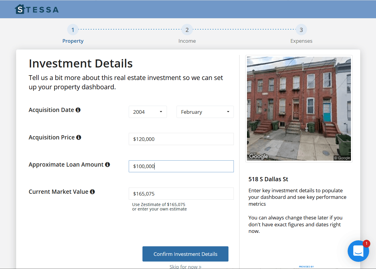 When you first register, Stessa asks you a few simple questions to initiate your account. They start by asking how many properties you own, and a property address to kick off the process. From there, they pull up public record data about the property, and you’re off and running.