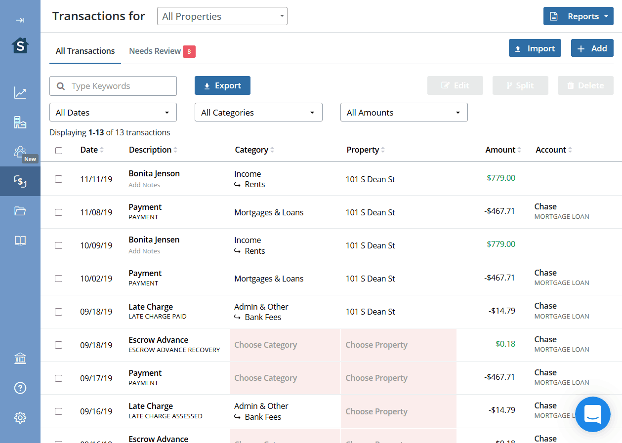 As rents come in and expenses like repairs go out, Stessa pulls the transaction data from your bank and does its best to label it. Sometimes you’ll still need to get in and clean up the transactions a bit, however.