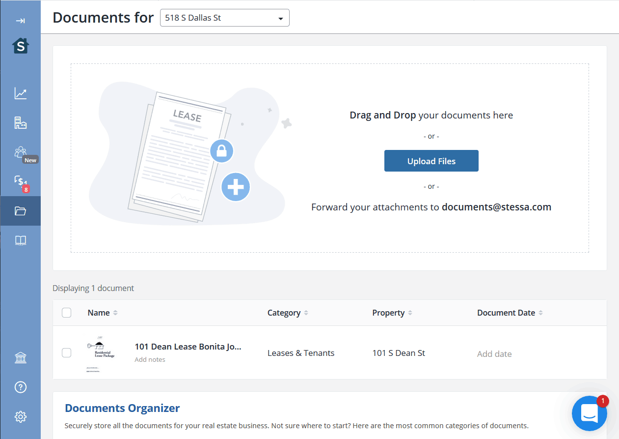 On Stessa, you can upload and store all your documents, each labeled and assigned to a specific property or unit. When you need to access your documents, you can sort by property, date, or document category.